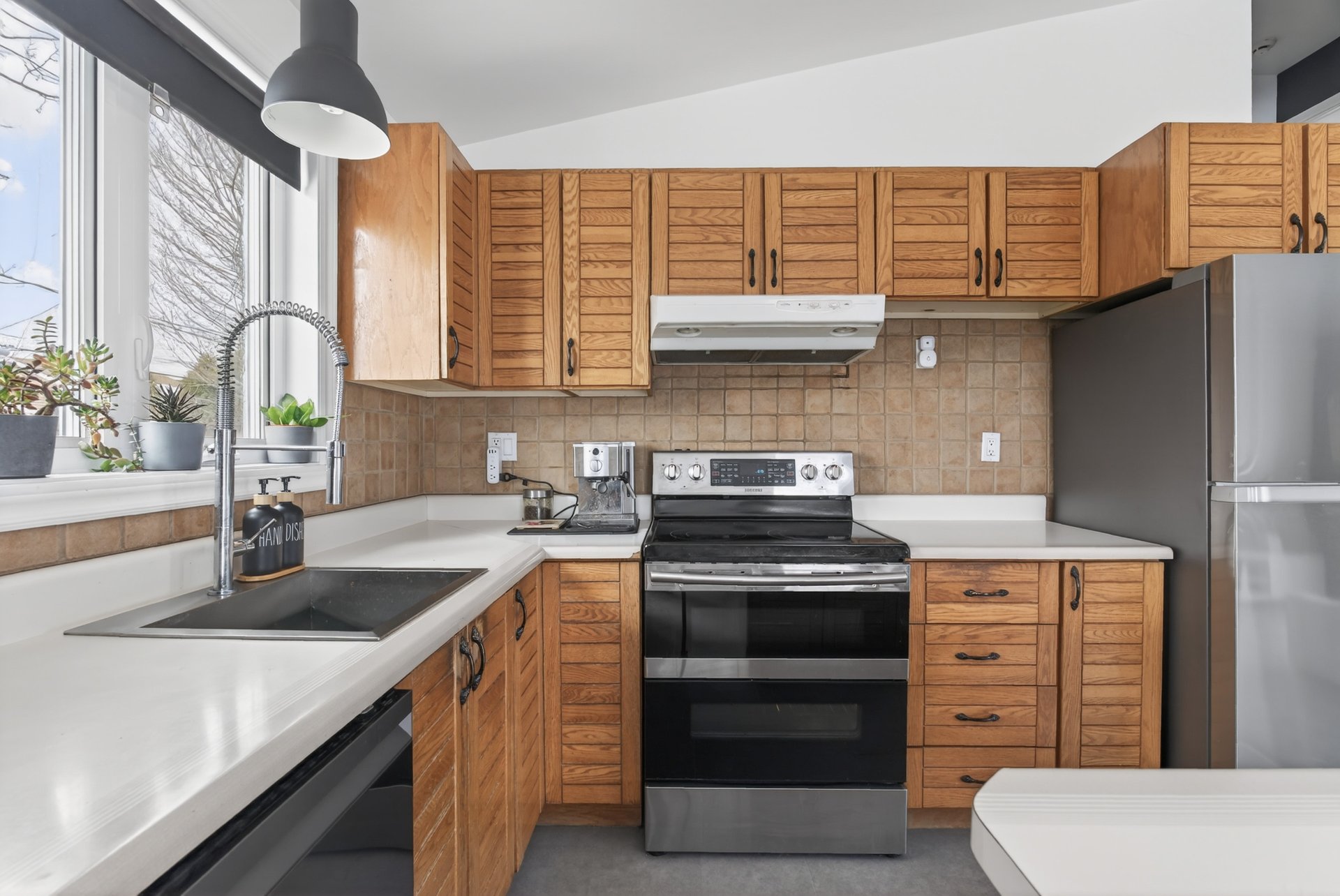 - La cuisine en bois, au style mid-century, propose un
