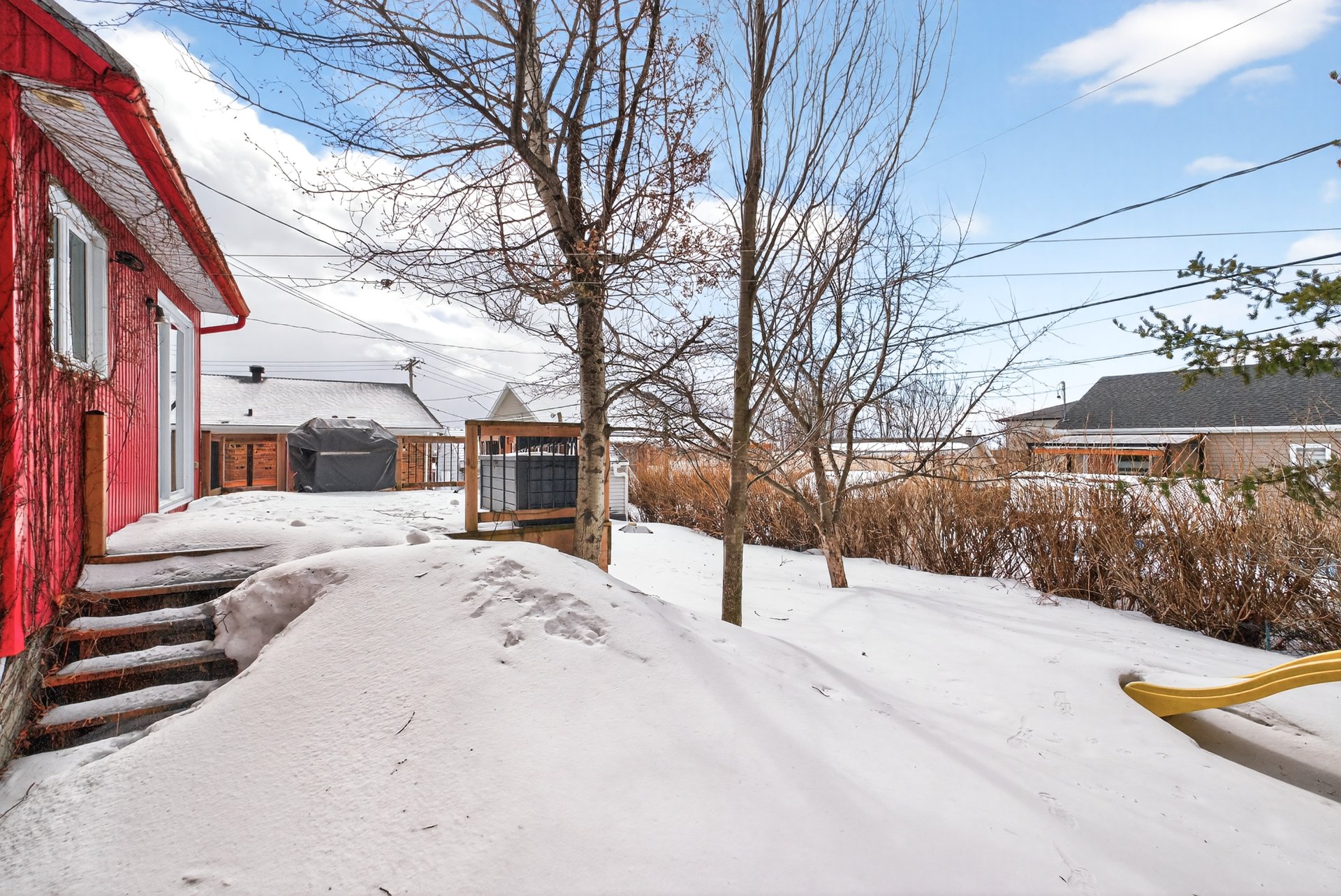 À l'extérieur, la cour arrière intime est bordée d'arbres
