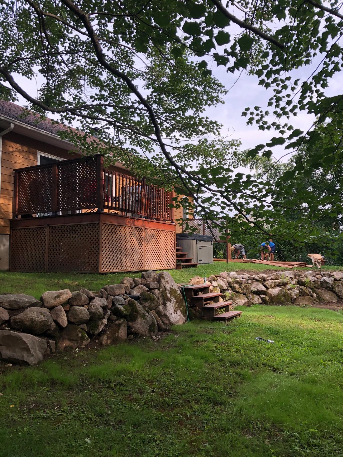 Terrasse en bois, espace spa (non-fonctionnel) et cabanon